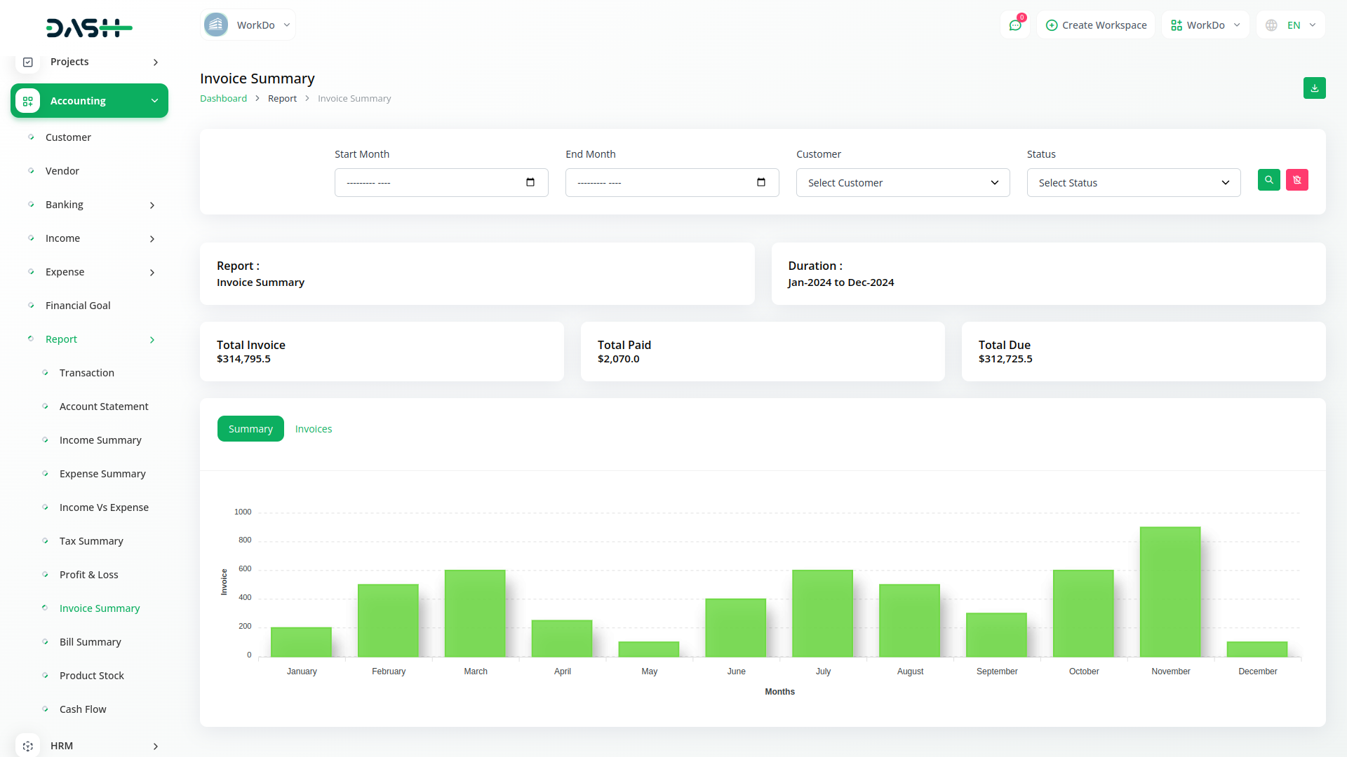 Easily filter reports by account, category, customer, or financial year, and download them in your preferred format: PDF, CSV, or Excel. Visualise your financial health with built-in Income vs. Expense charts and Profit & Loss calculations, helping you make smarter, data-driven decisions.